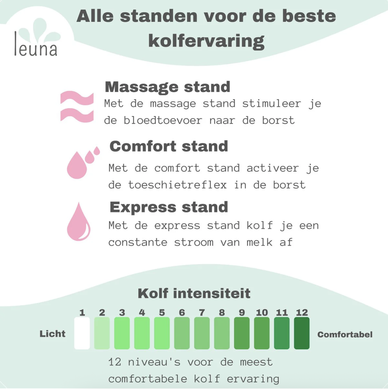 De kolfstanden zijn speciaal ontworpen om de toeschietreflex gemakkelijk op gang te brengen en om de drinkgewoonte van de baby exact na te bootsen. Het kolfapparaat masseert en stimuleert de tepels eerst, waardoor de toeschietreflex geactiveerd wordt.