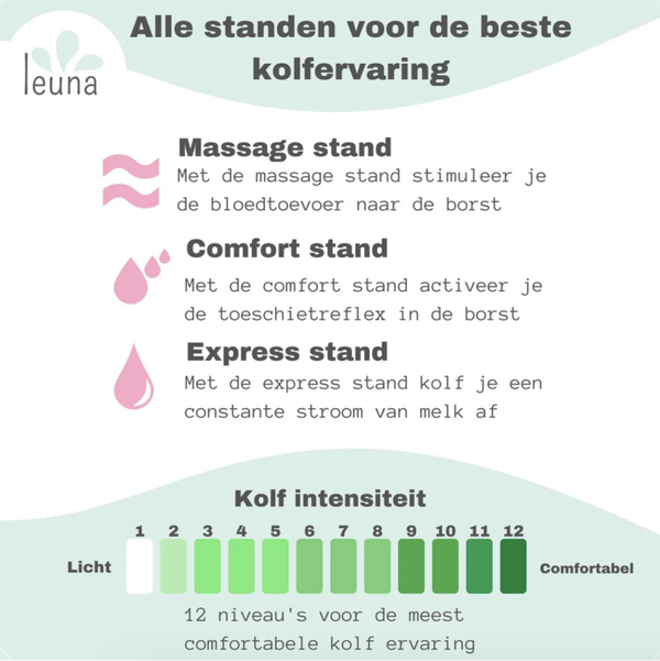 De Leuna borstkolf heeft een batterijcapaciteit waarmee je 3 uur kunt kolven, wat overeenkomt met 12 kolfsessies van 15 minuten.