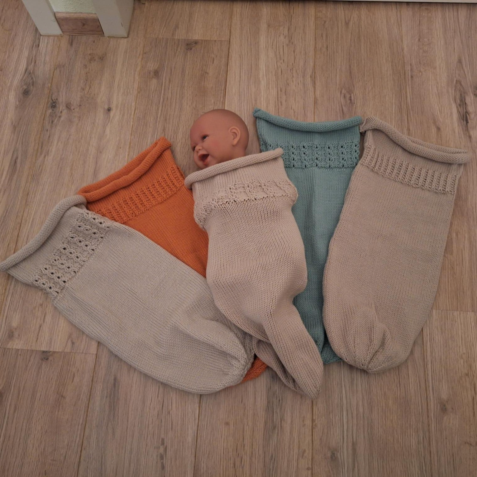 Gebreide geboortecocon : Dit is een nauwsluitend zakje van natuurlijke merinowol. Het is ontworpen om de baby warm te houden de baby vrij kan bewegen met de beentjes. Merinowol is populair omdat het zelfregulerend is en niet jeukt.